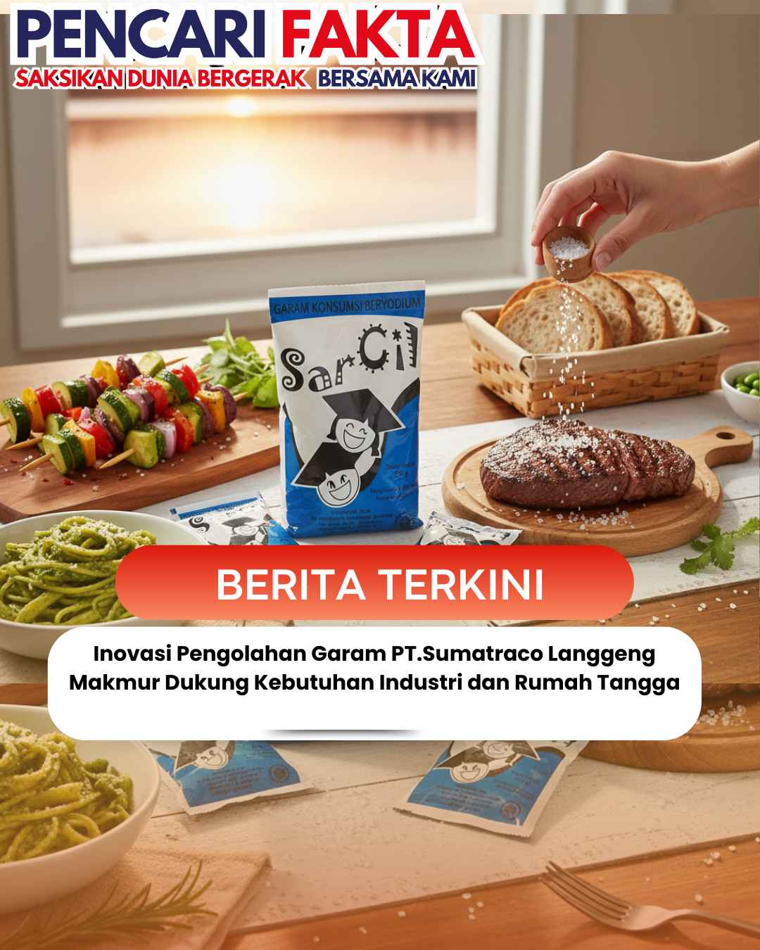 www.pencarifakta.com.ǁSurabaya,4 februari 2026-PT.Sumatraco Langgeng Makmur, perusahaan yang bergerak di bidang produksi dan pengolahan garam, terus menunjukkan komitmennya dalam mendukung pemenuhan kebutuhan garam nasional, baik untuk sektor industri maupun rumah tangga. Berbasis di Surabaya, perusahaan ini mengembangkan berbagai inovasi teknologi pengolahan garam yang berorientasi pada peningkatan kualitas produk, efisiensi produksi, serta daya saing di pasar global.
