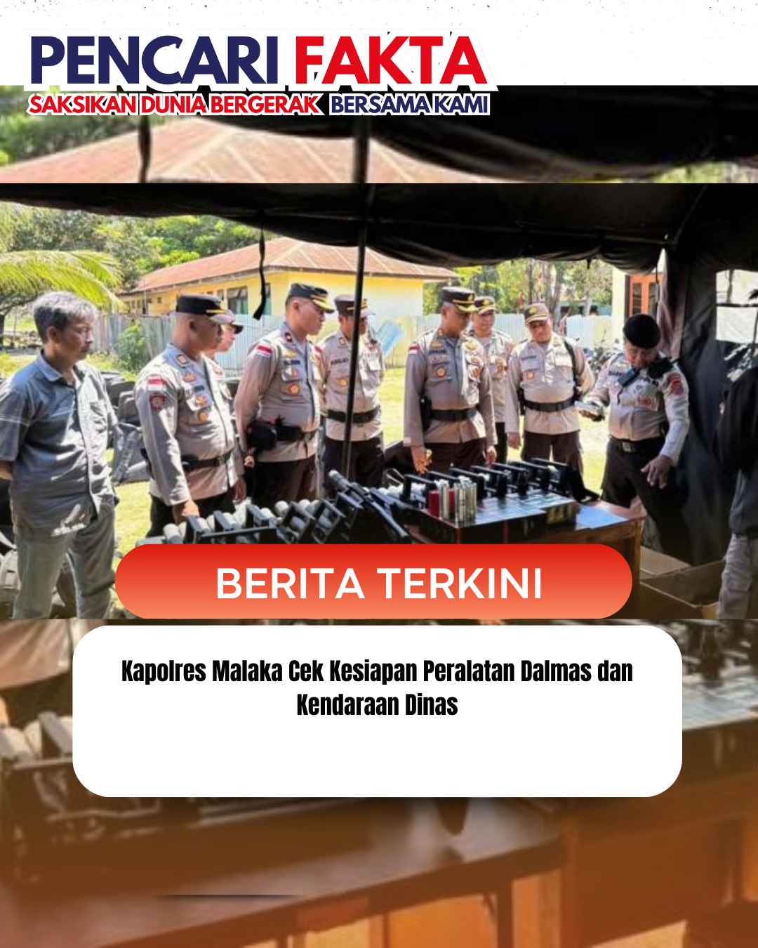 www.pencarifakta.com.ǁNTT,1 September 2025-Dalam rangka memastikan kesiapan sarana dan prasarana pendukung tugas kepolisian, Kapolres Malaka AKBP Riki Ganjar Gumilar, S.I.K., M.M., didampingi Wakapolres Malaka, melaksanakan pengecekan langsung terhadap peralatan Dalmas di Mapolres Malaka, Minggu (31/8/2025).